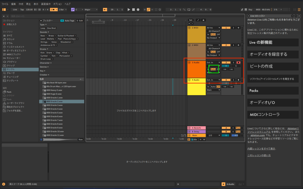 AbletonLiveのプロジェクトを起動すると、画像のようにオーディオトラックが立ち上がっていますので、画像緑枠を「Auto」に変更してください。こちらのトラックを通った自身の声が講師に伝わります。